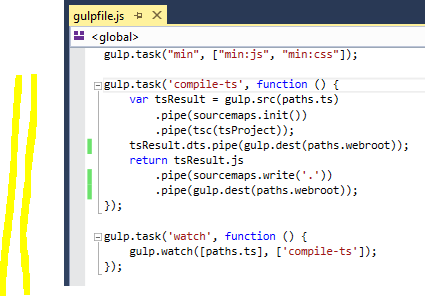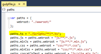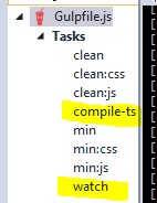 - Add a file "_tsconfig.json" to the Scripts folder (can be any name, but the name appears in "gulpfile.js"). I just renamed my existing "tsconfig.json" to "_tsconfig.json" to hide it from Visual Studio and re-use it with gulp-typescript.