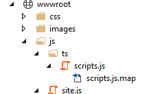 - A Visual Studio build will generate "scripts.js" and "scripts.js.map" (.map for debugging Typescript source code in IE or at least watching Typescript in Chrome).